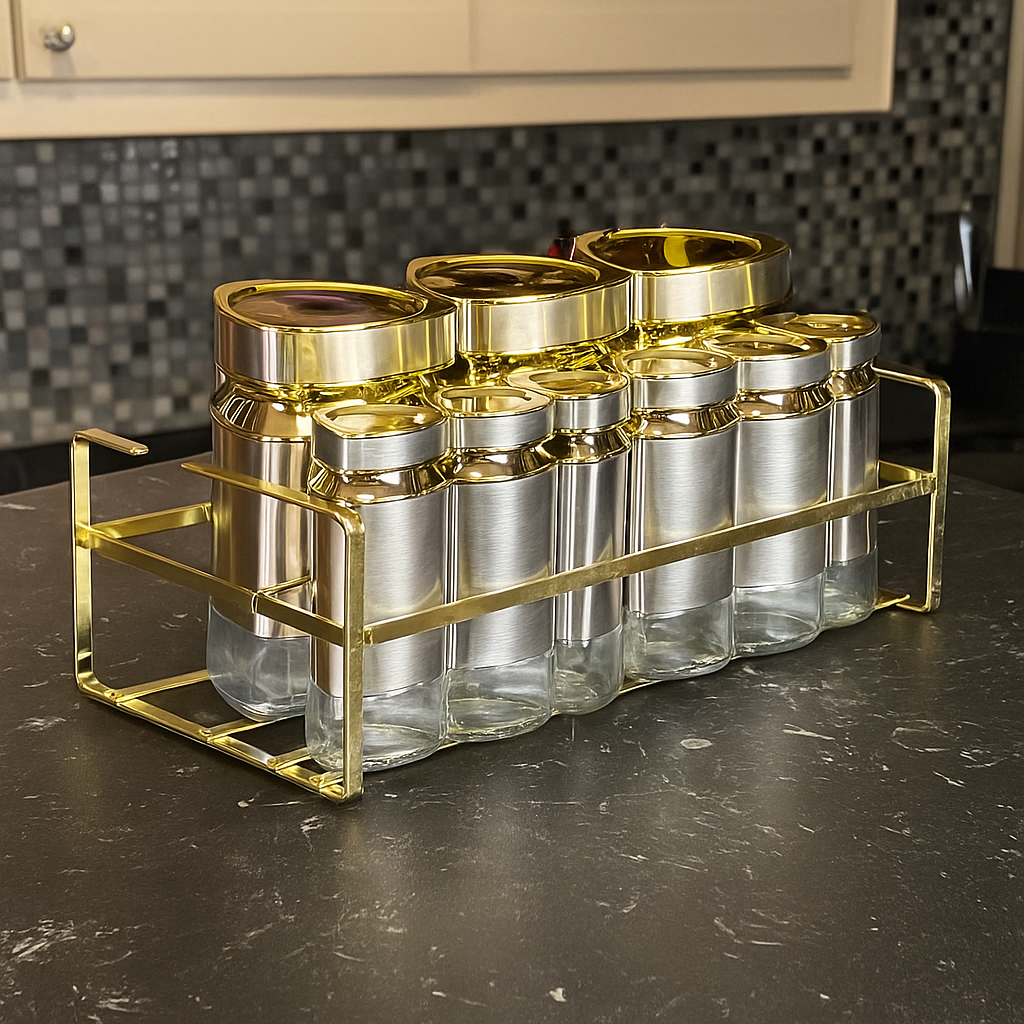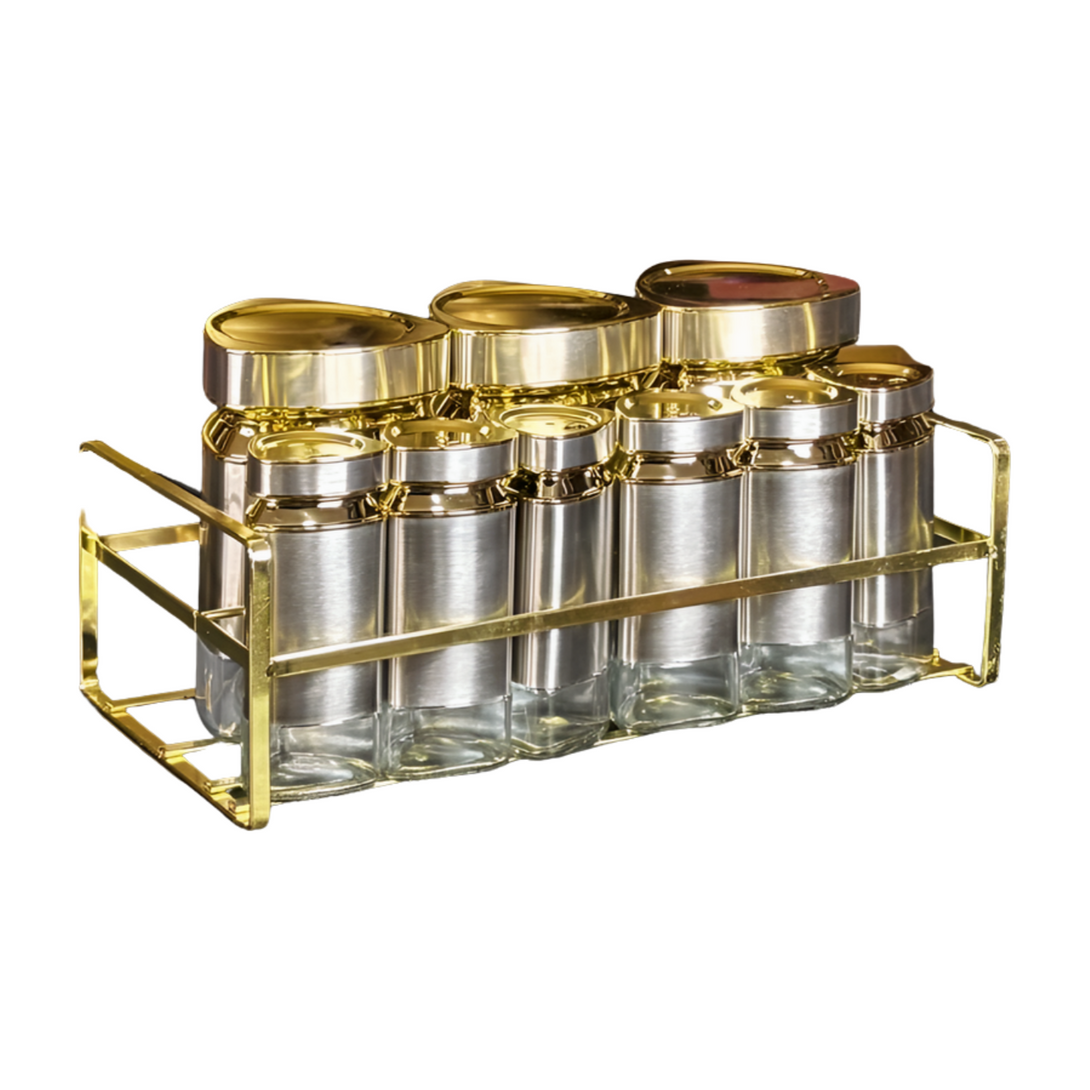 يضم 9 برطمانات زجاجية شفافة مزودة بغطاء معدني باللون الذهبي اللامع لإضافة لمسة فاخرة لمطبخك.