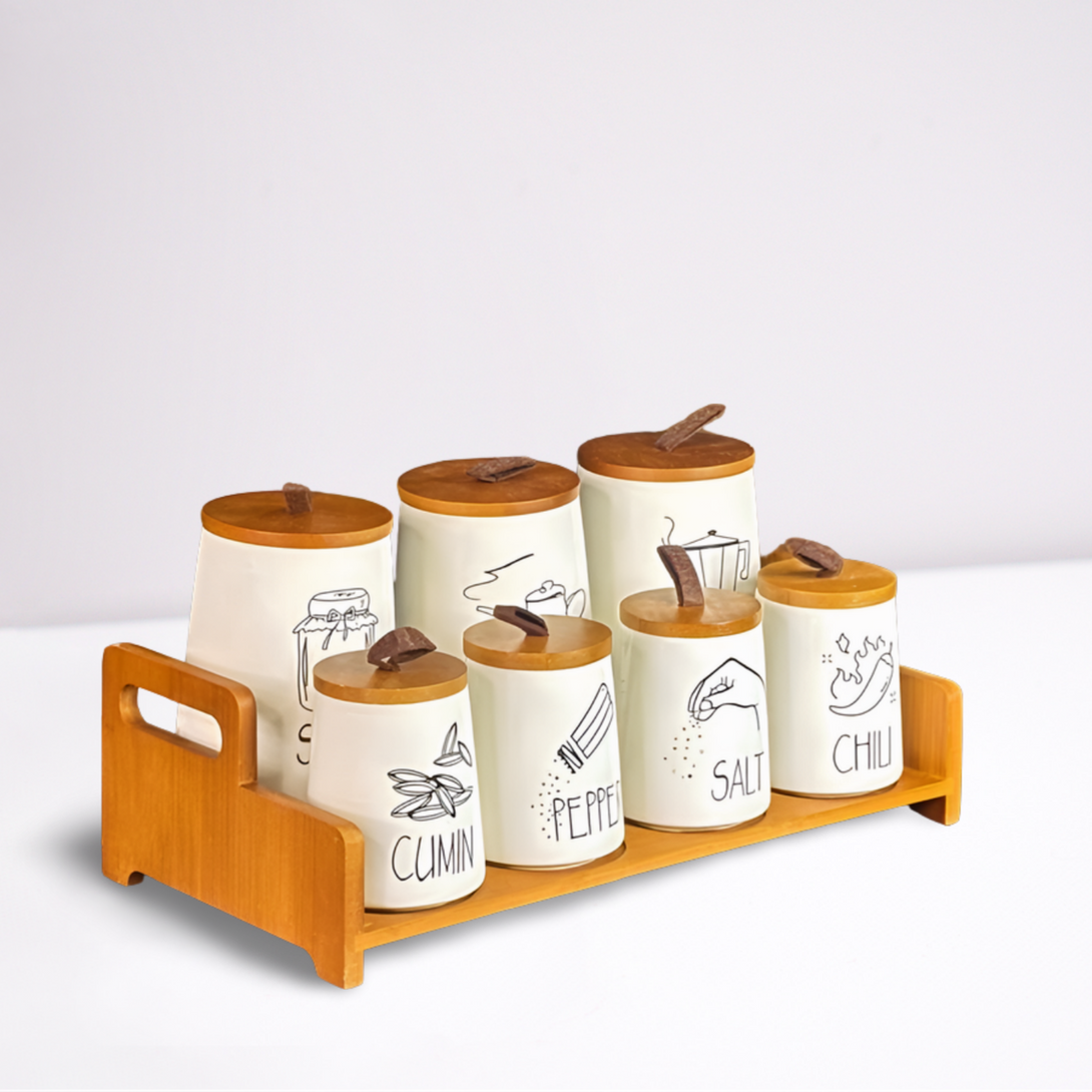 أضف لمسة من الأناقة والتنظيم إلى مطبخك مع طقم التوابل الخشبي الفريد هذا. صُمم هذا الطقم ليجمع بين الجمال والعملية، حيث يضم 6 برطمانات توابل سيراميك باللون الأبيض مزينة برسومات يدوية جذابة.