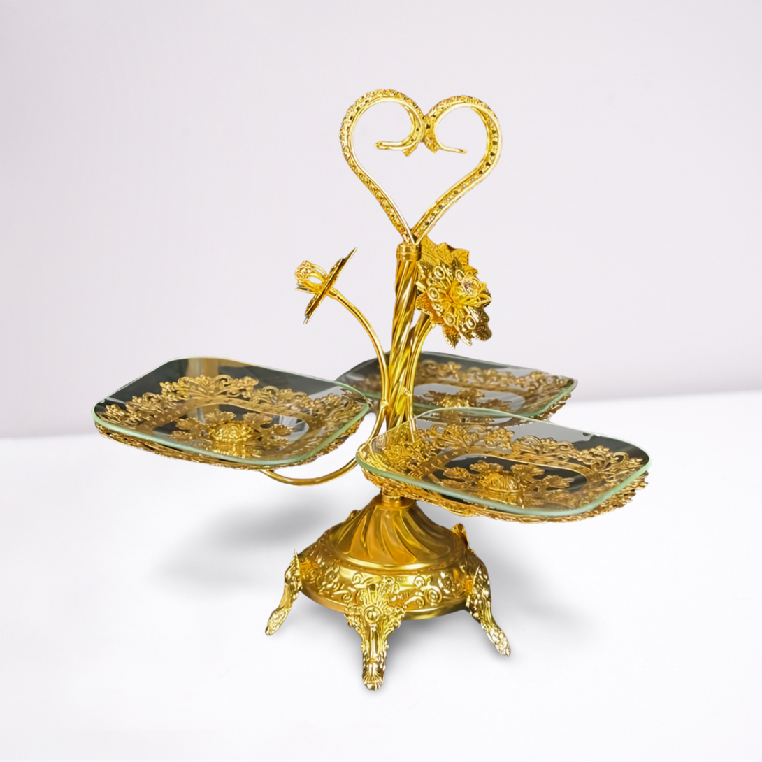 تصميم فاخر وفريد: تتميز بثلاثة أطباق زجاجية مربعة الشكل، مزينة بنقوش ذهبية معقدة، مثبتة على حامل ذهبي مزخرف بتفاصيل دقيقة وأرجل أنيقة. المقبض العلوي على شكل قلب مزدوج يضيف لمسة رومانسية وجمالية