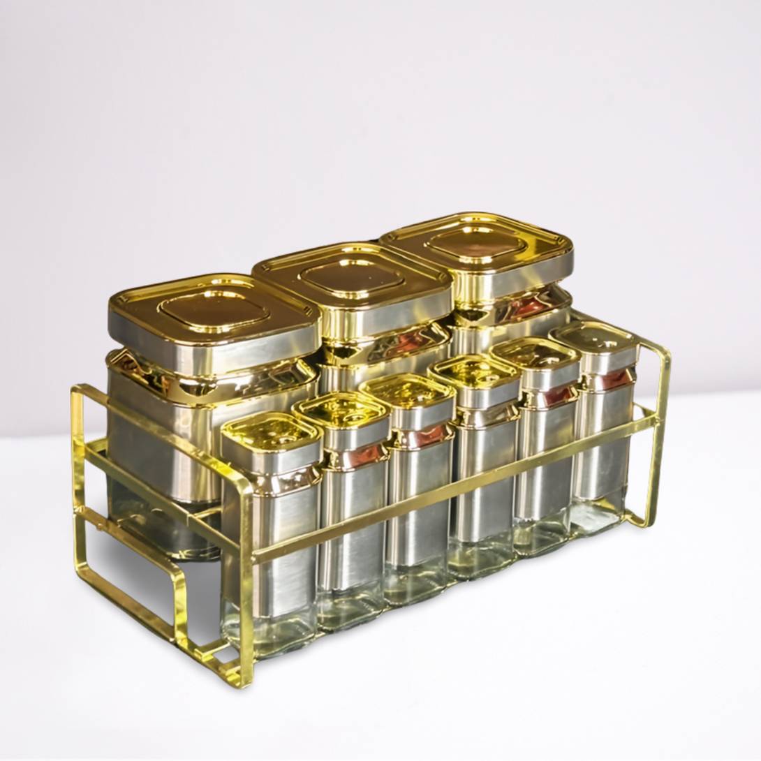 طقم عملي ومتكامل: يتكون من 9 قطع بأحجام مختلفة لتناسب جميع احتياجاتك، بالإضافة إلى حامل معدني ذهبي لتنظيم أنيق وتوفير مساحة.