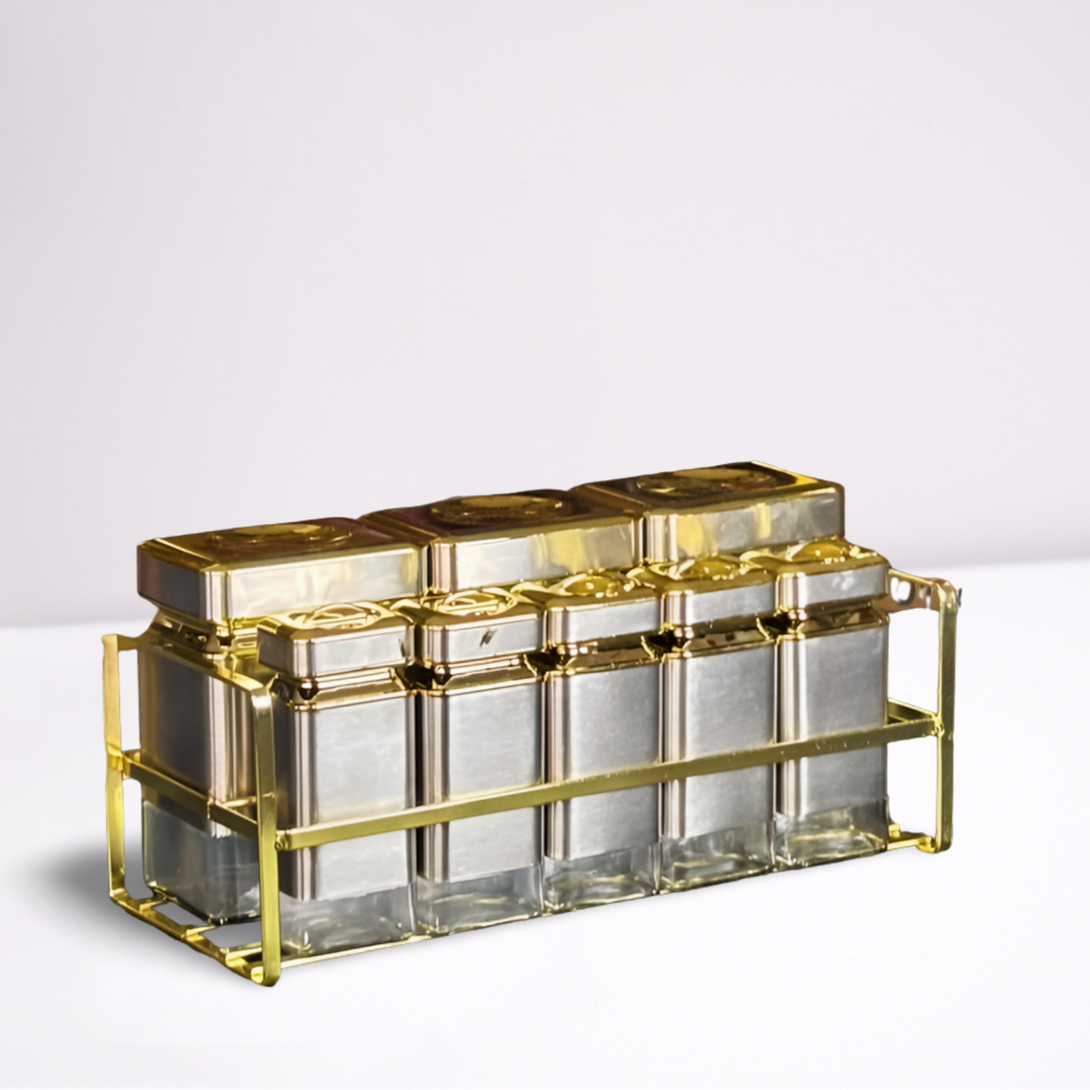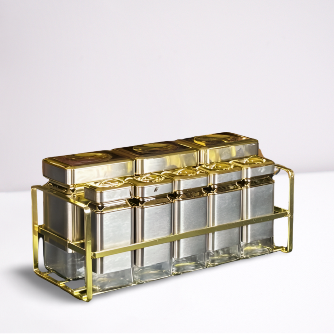خامات عالية الجودة: مصنوع من الزجاج المتين الشفاف مع أغطية معدنية باللون الذهبي اللامع، مما يضمن الحفاظ على التوابل طازجة ومنظمة.