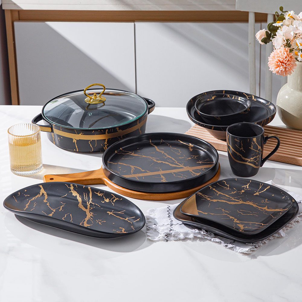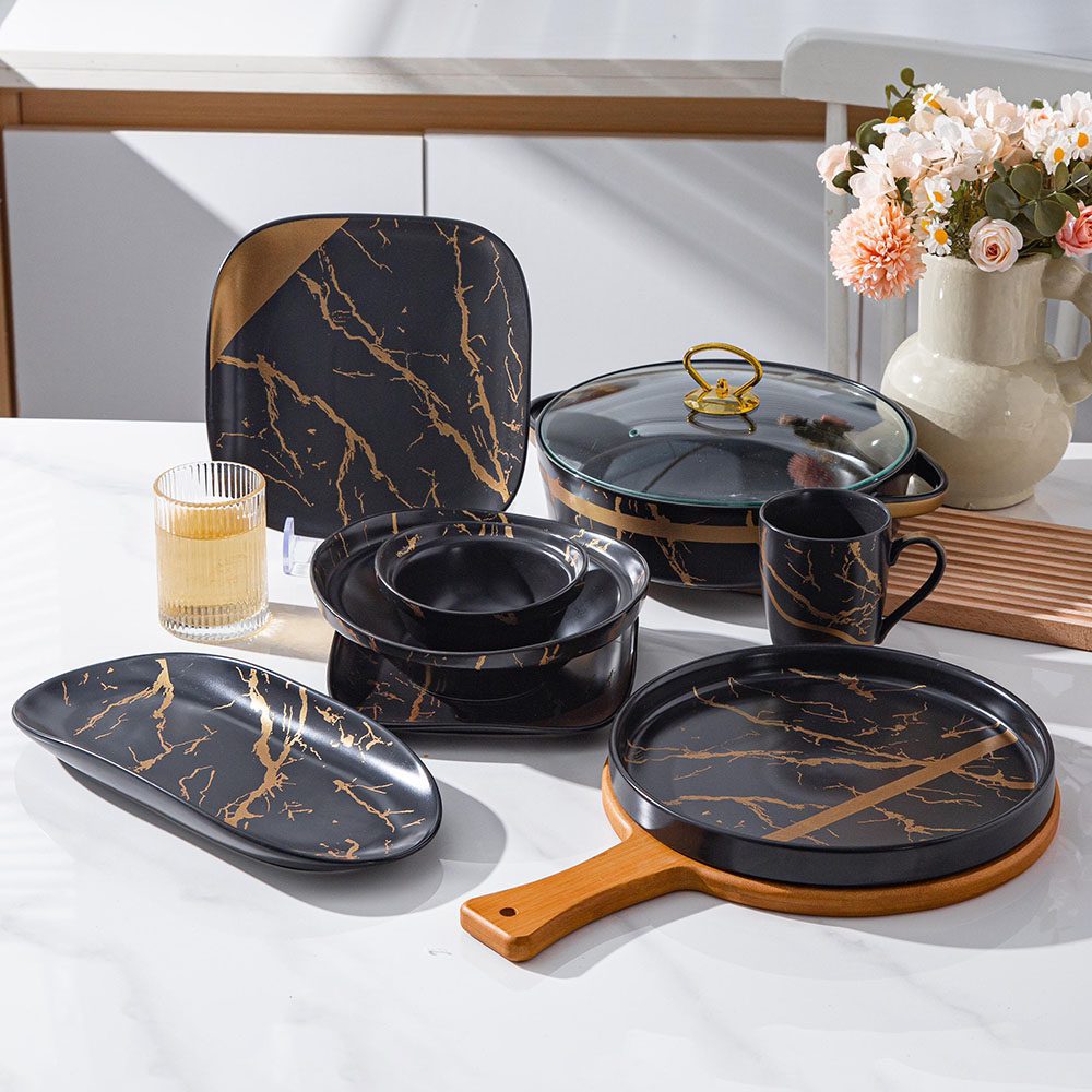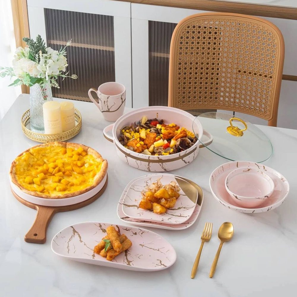 الطقم بالكامل مصنوع من خامات عاليه الجوده مطعم بالذهب صالح لاستخدام الفرن والمايكروويف وغساله الاطباق